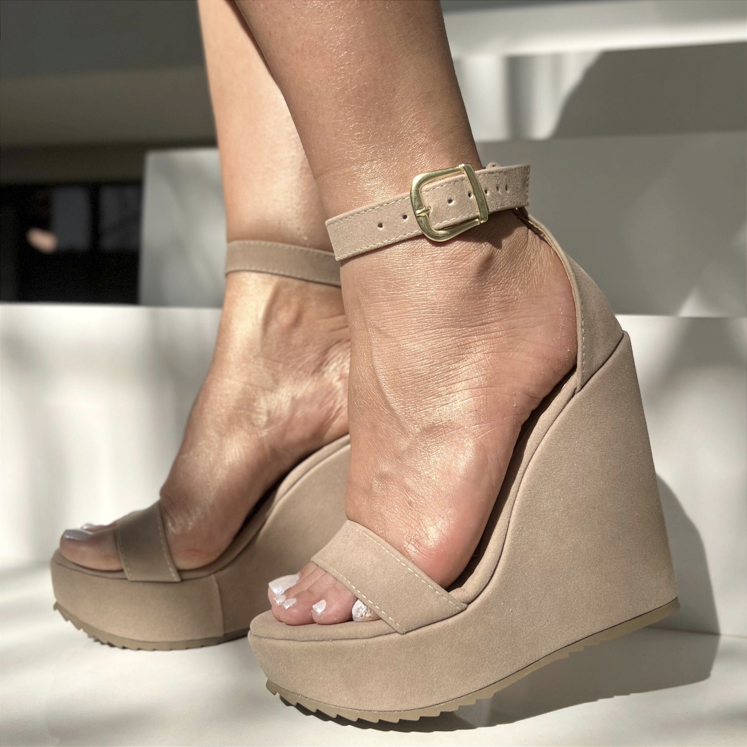 Anabela Sandália Feminina Salto Plataforma Tiras Média Salto 13 Nude