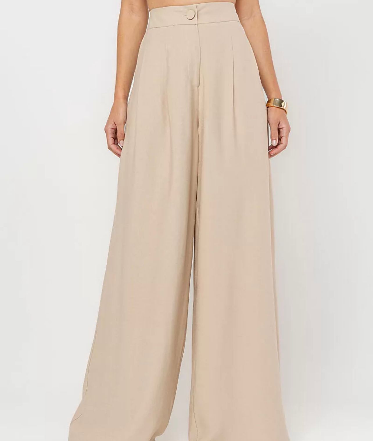 A calça é modelo Pantalona com cintura alta, possui bolso estilo faca, botão encapado do proprio tecido, possui zíper na frente.