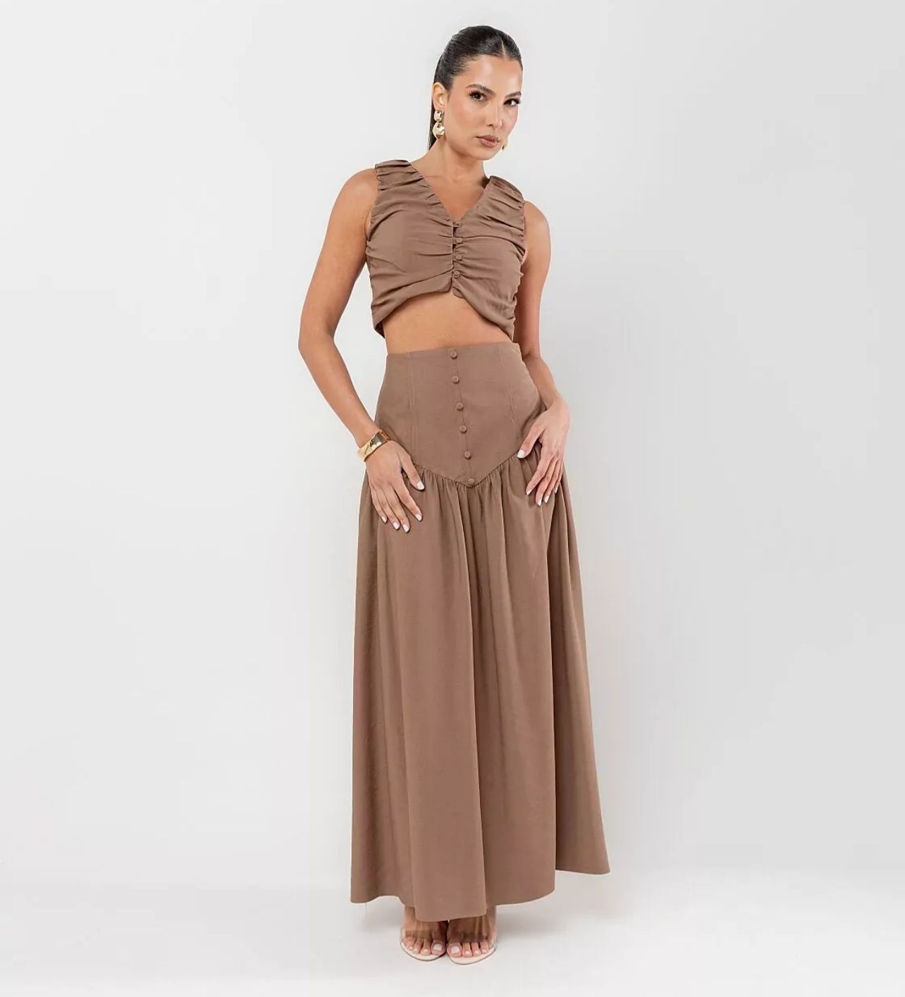 Conjunto Cropped Drapeado e Saia Longa Catarina Alfaiataria Nobre Cores