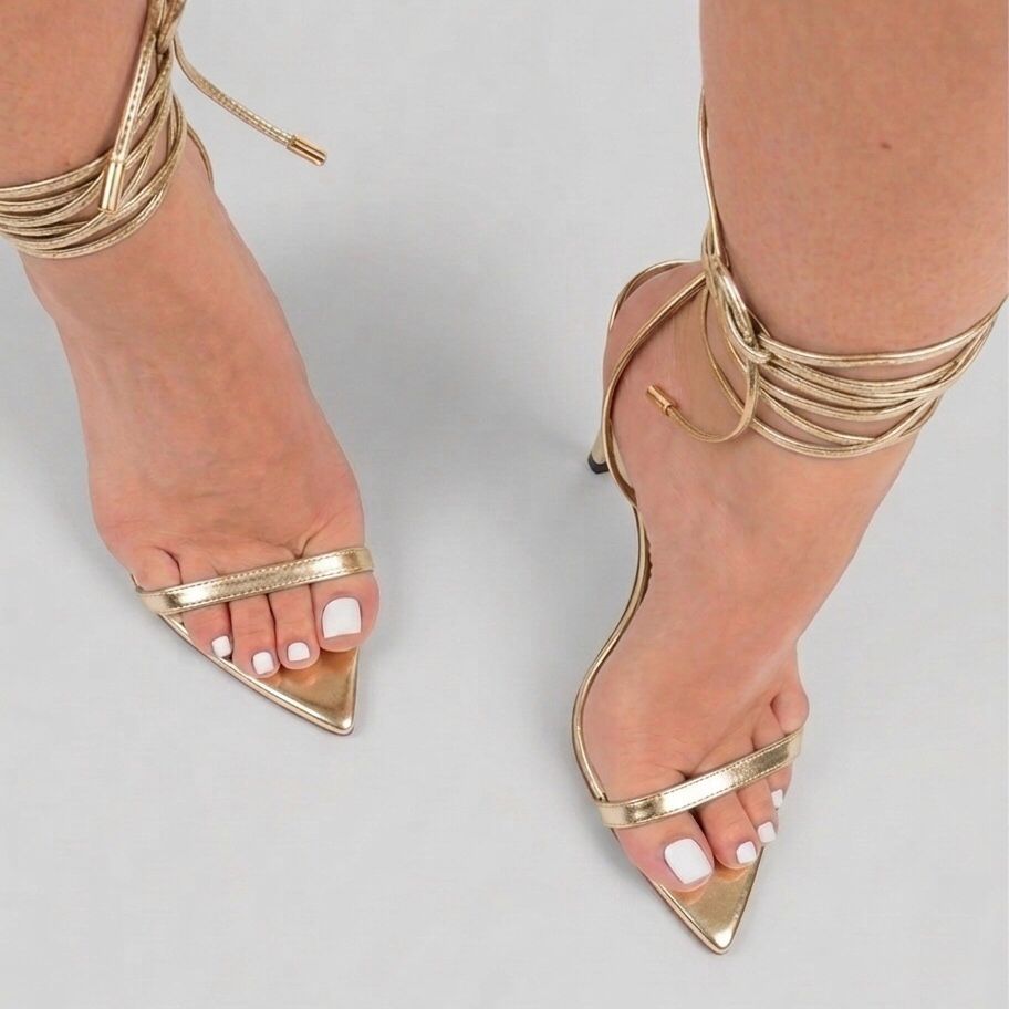 Sandália Bico Folha Salto Fino Tiras Finas Amarração Ouro Light
