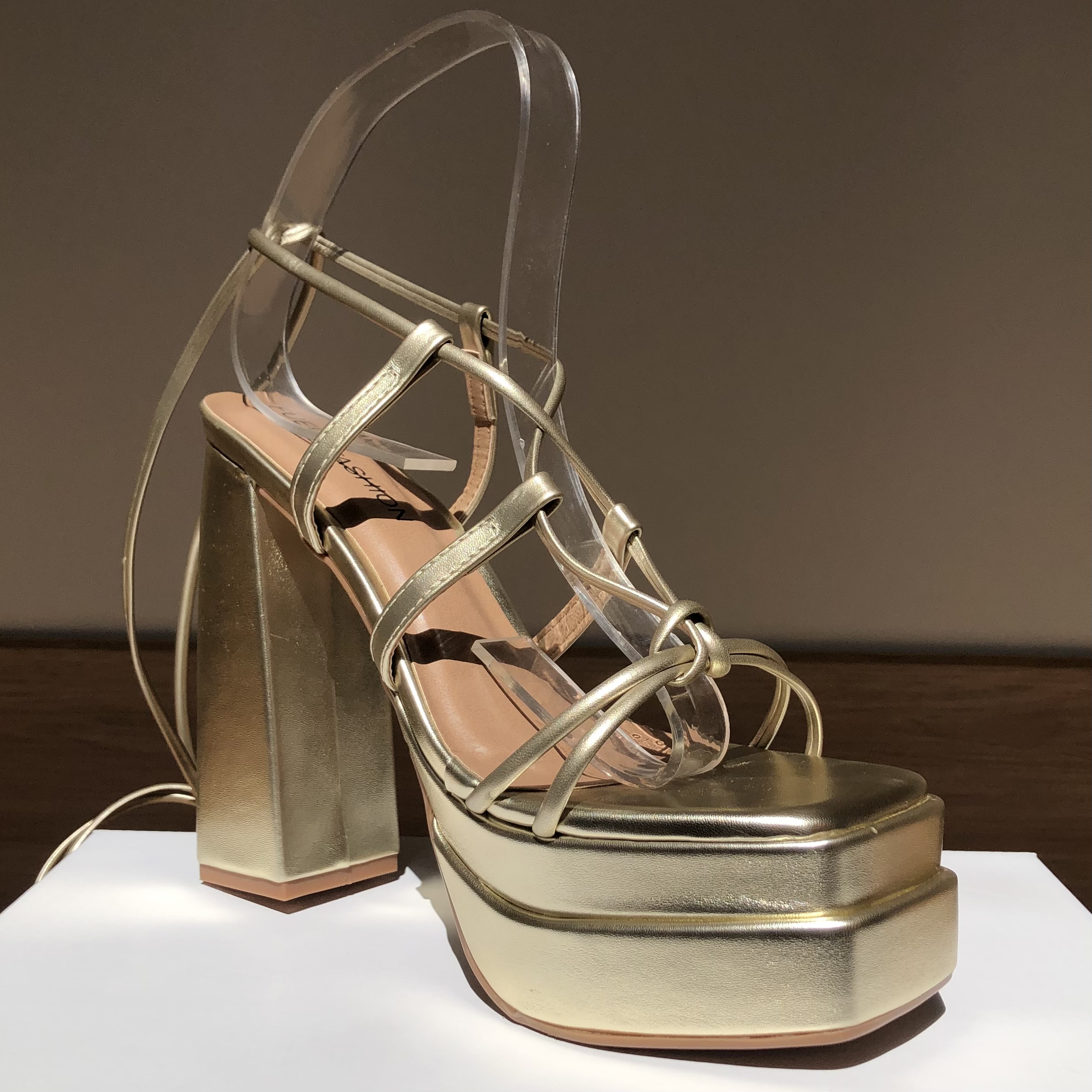 Sandália Plataforma Salto Bloco Alto Amarração Dourada