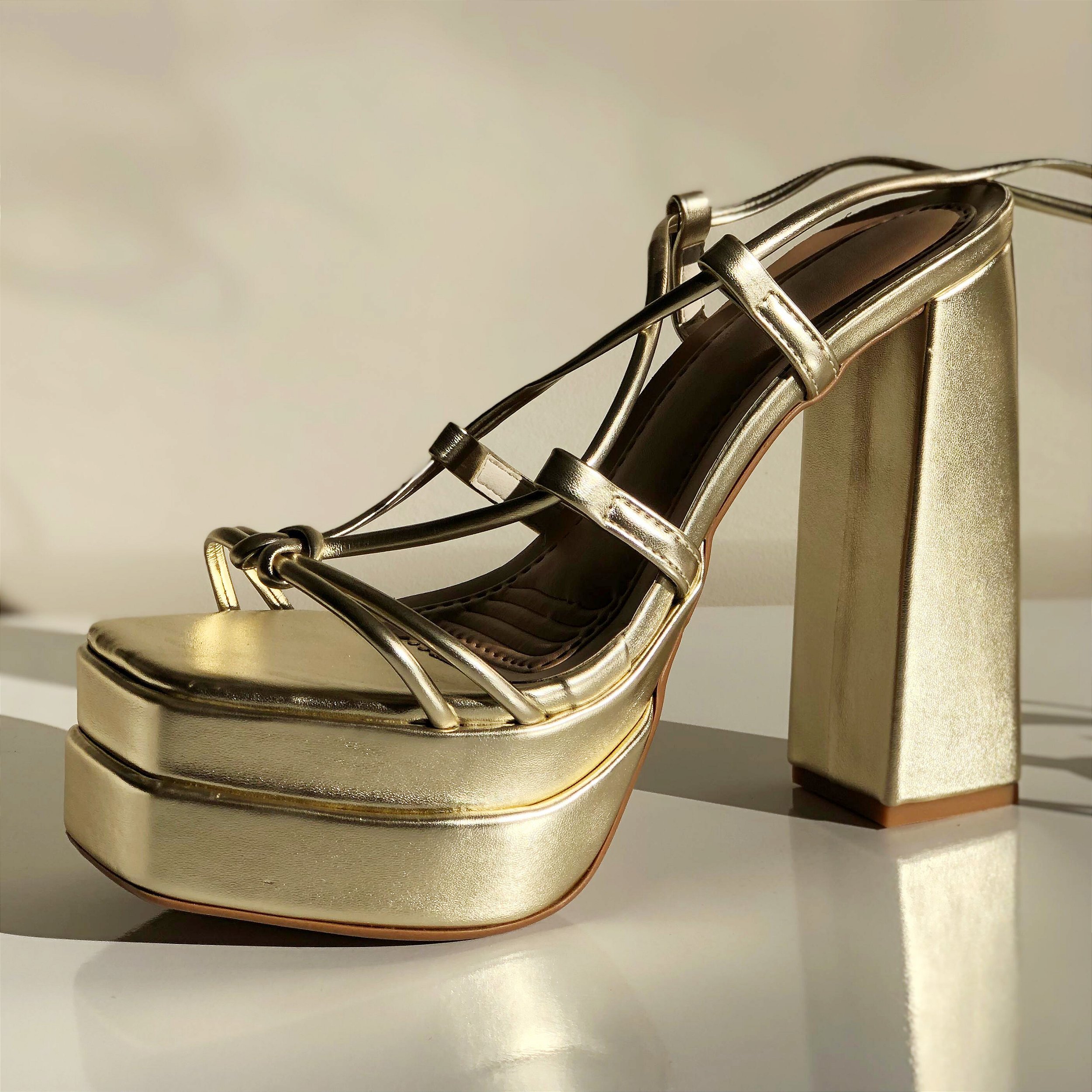 Sandália Plataforma Salto Bloco Alto Amarração Dourada