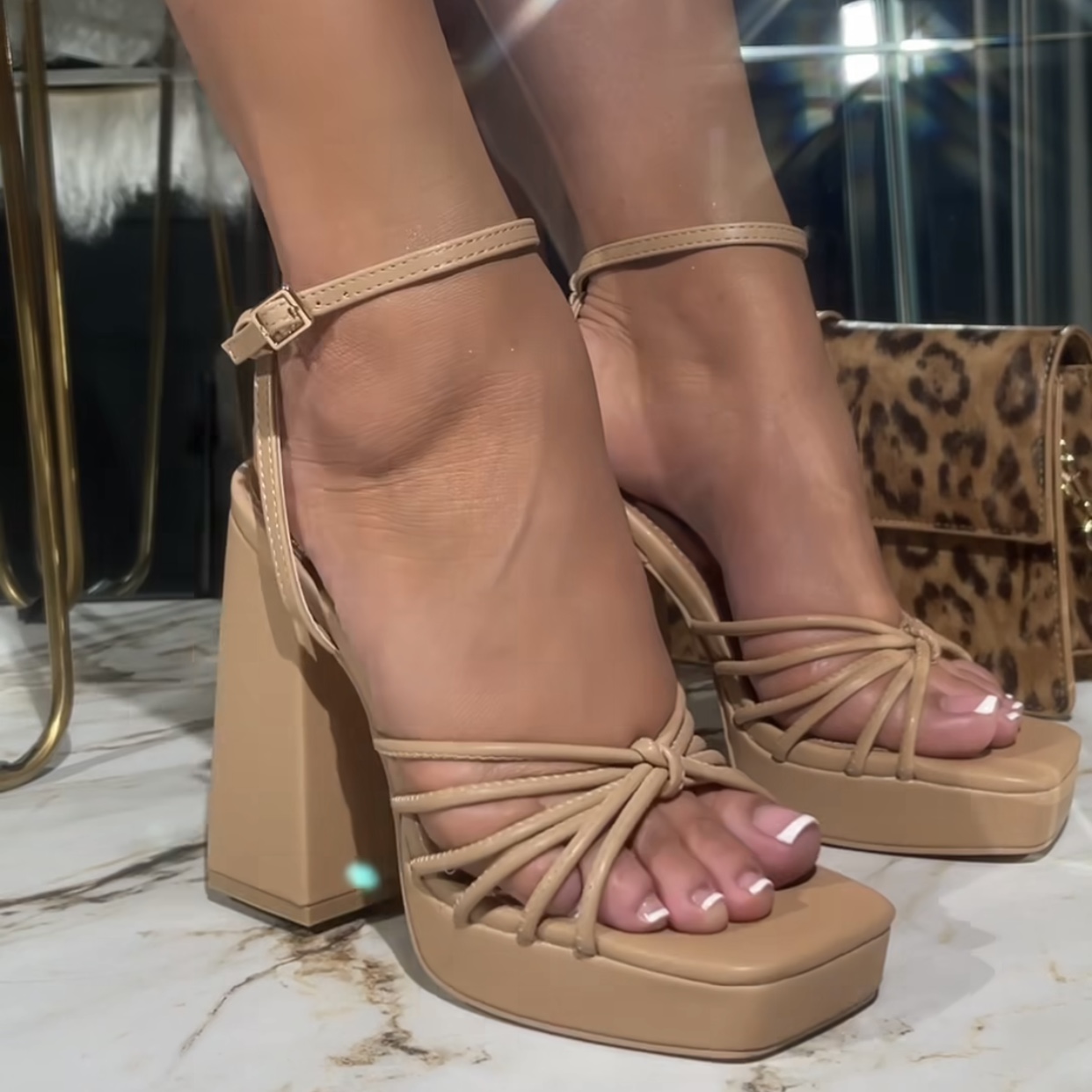 Sandália Salto Bloco Alto Meia Pata com Várias Tiras Salto 12 Nude