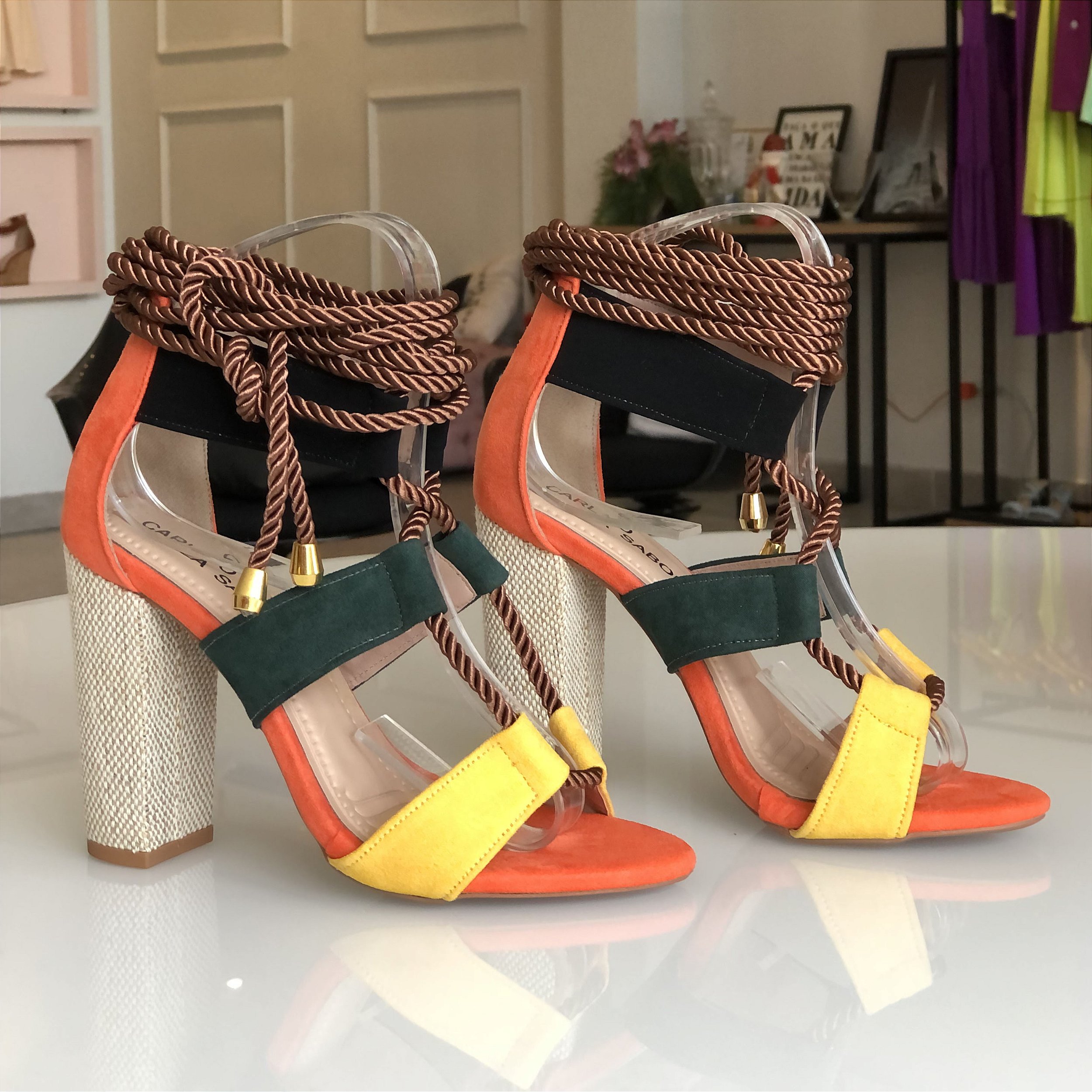 Sandália Salto Bloco Cordão e Amarração Multicolor