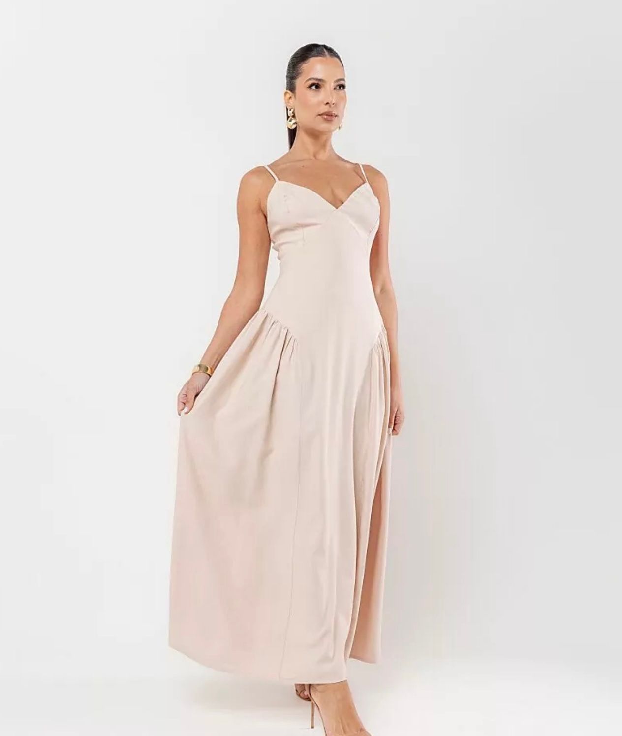 Vestido Longo Drapeado e Alcinha em Alfaiataria Nobre